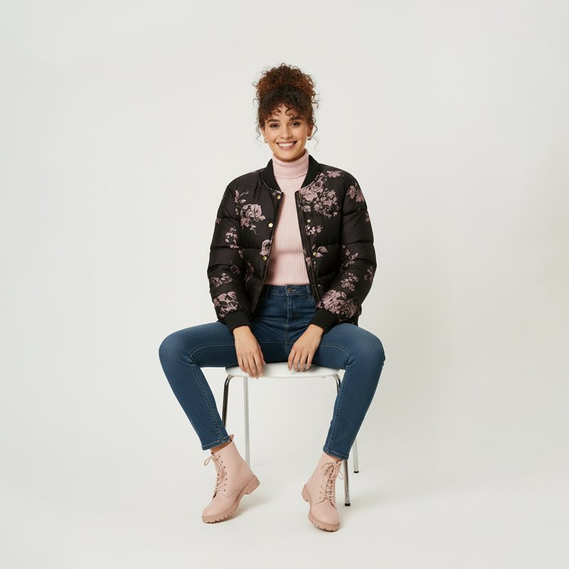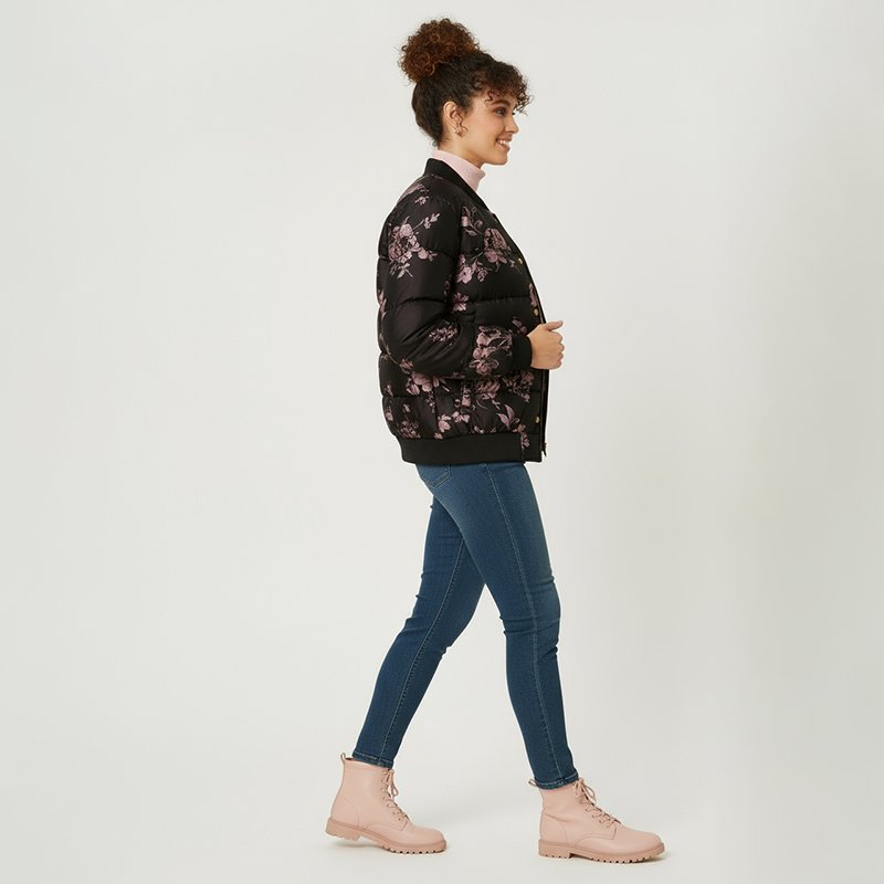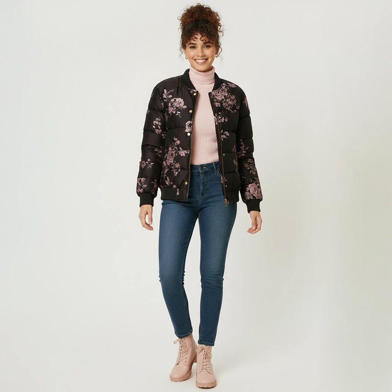 Bring effortless charm to your winter wardrobe with this black floral puffer bomber, blending cozy warmth with a feminine, everyday streetwear edge.