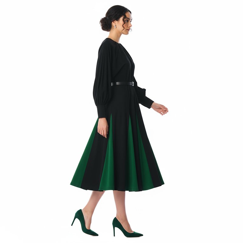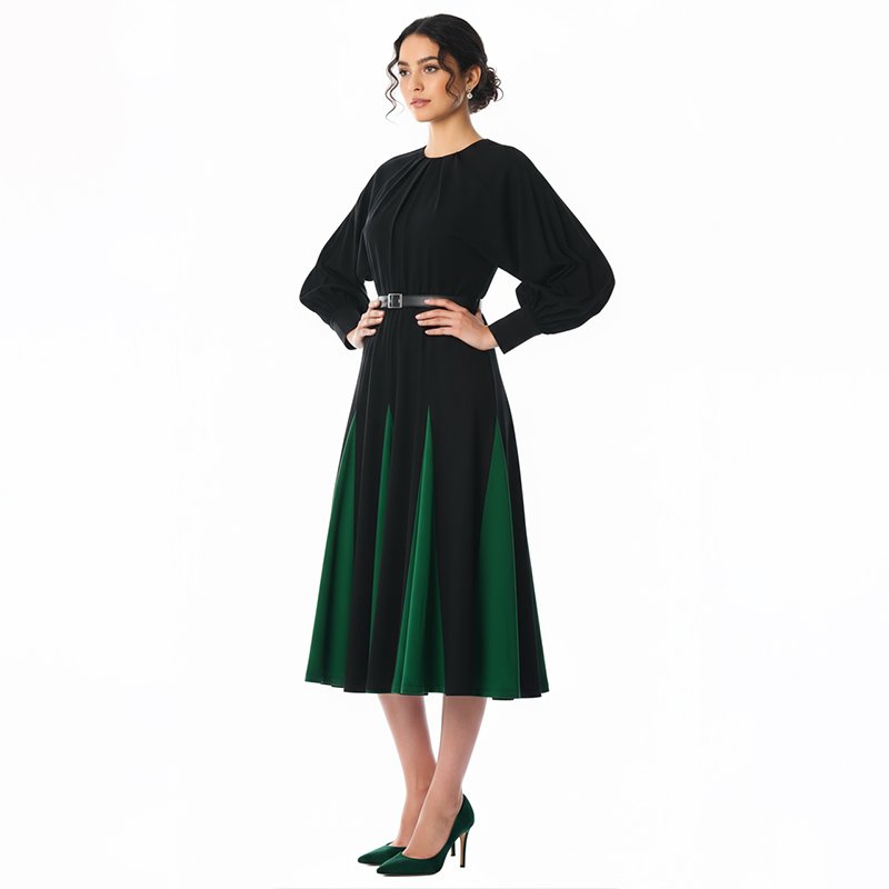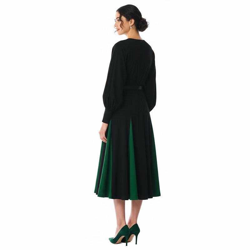 Step into bold sophistication with this black midi dress accented by vibrant green pleats, perfect for making a statement at any occasion.Model is 5'7" and wearing size Small. You can select your height before purchase for the perfect fit.
