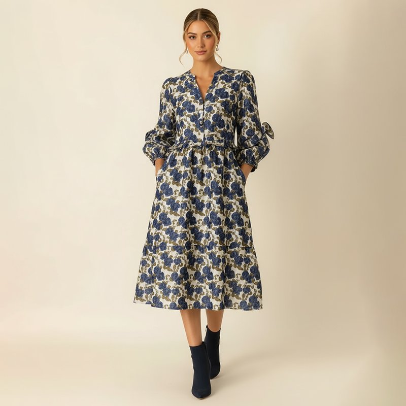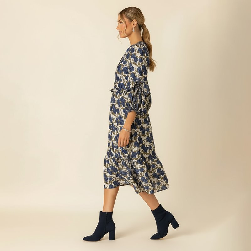 Step into charm with this blue floral puff sleeve midi dress, perfect for casual outings or stylish gatherings.