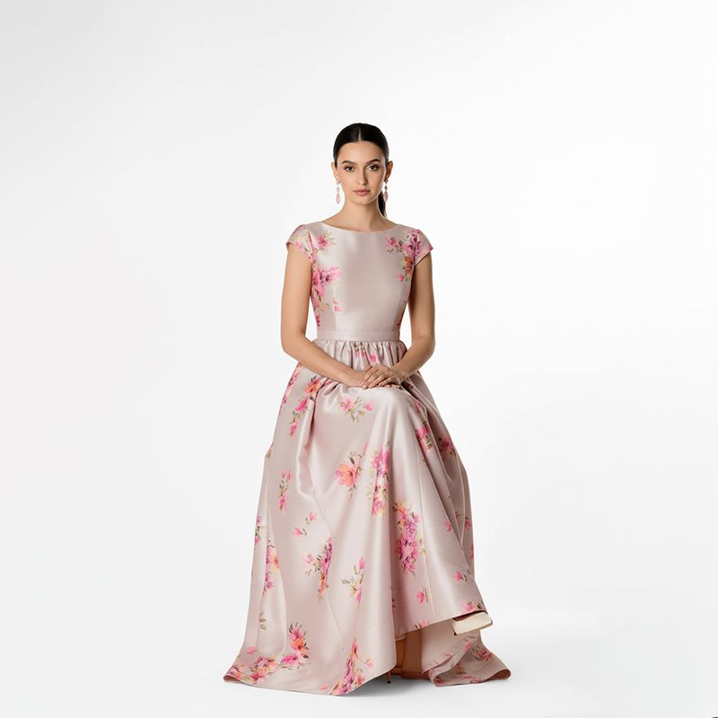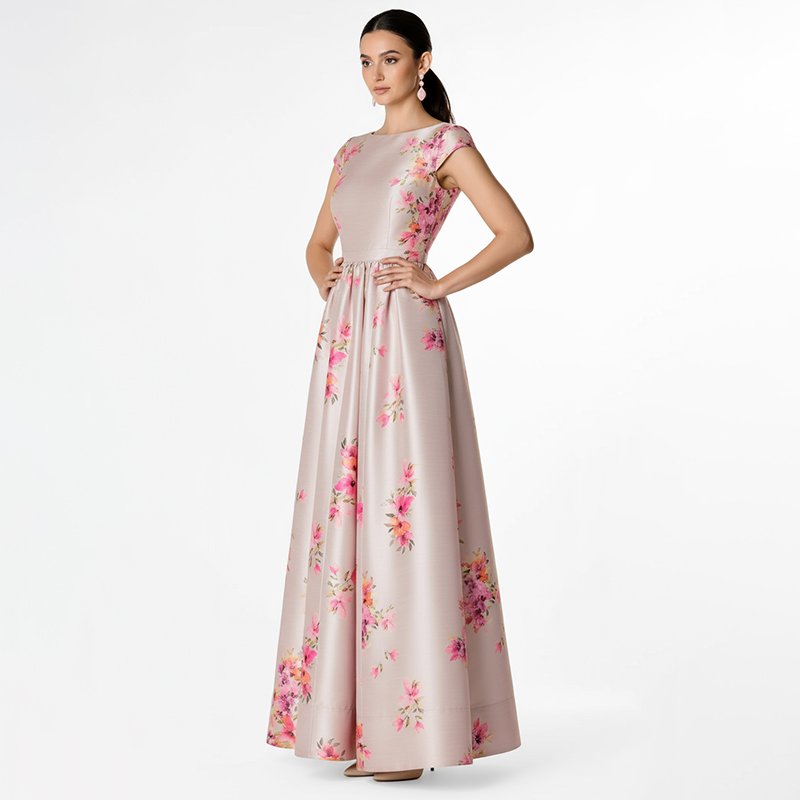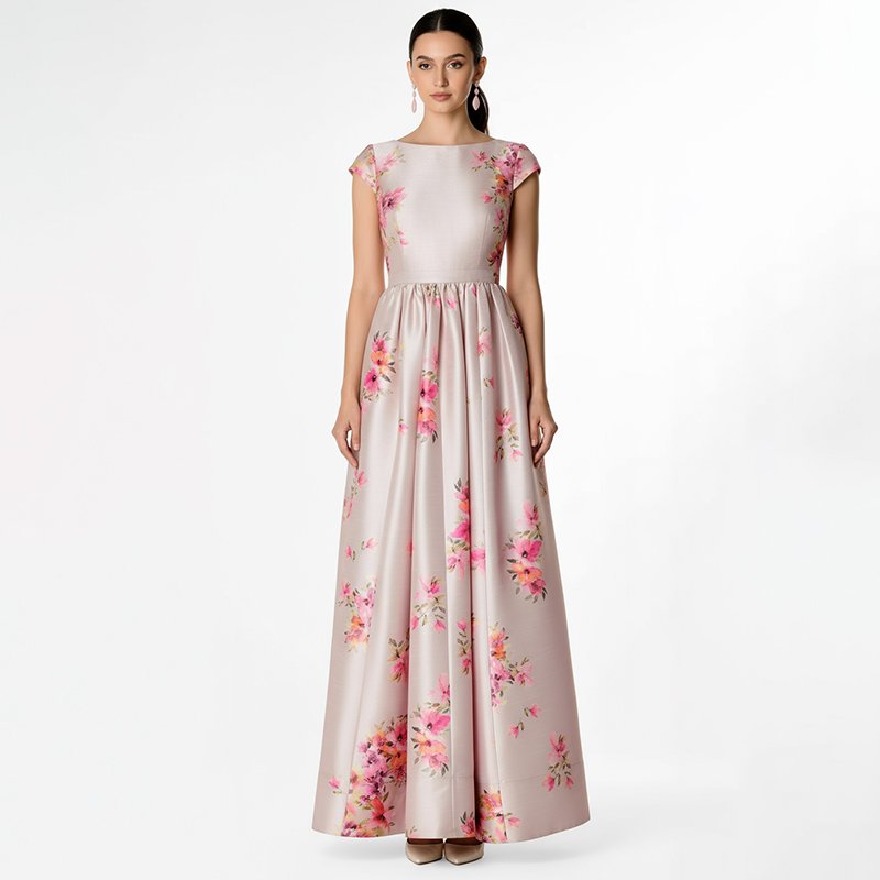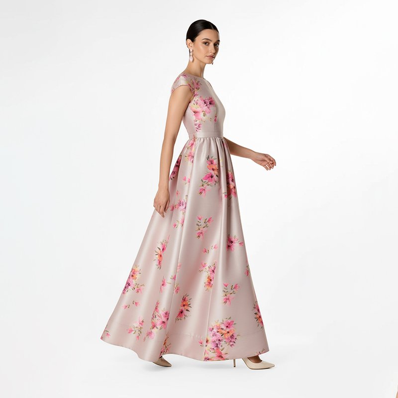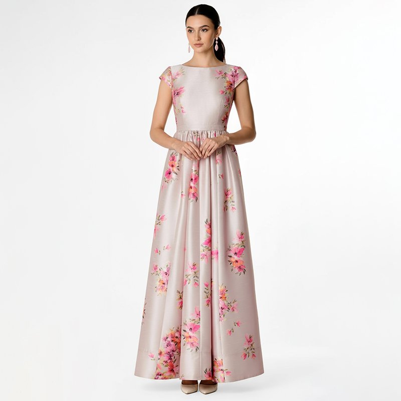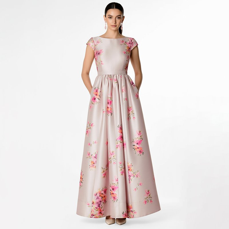 A soft blush pink satin maxi dress with delicate floral prints and a flattering A-line silhouette. Perfect for weddings, parties, and elegant gatherings.Model is 5'7" and wearing a size Small. Bust: 34", Waist: 26", Hips: 38", Length: 58". You can select your height before purchase for the perfect fit.