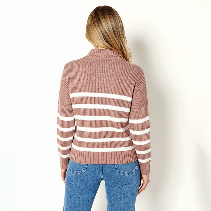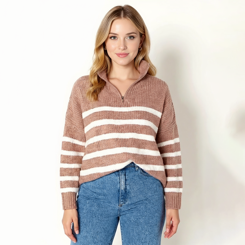 Stay cozy and stylish with the Celeste Classic Knit Sweater. This navy and white design adds a touch of elegance with its collar and zip detail. Featuring ribbed cuffs and a relaxed fit, it’s the perfect blend of comfort and fashion for any occasion.- long sleeves with ribbed cuffs