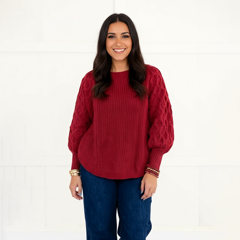 - Chunky cable knit sleeves for a textured look