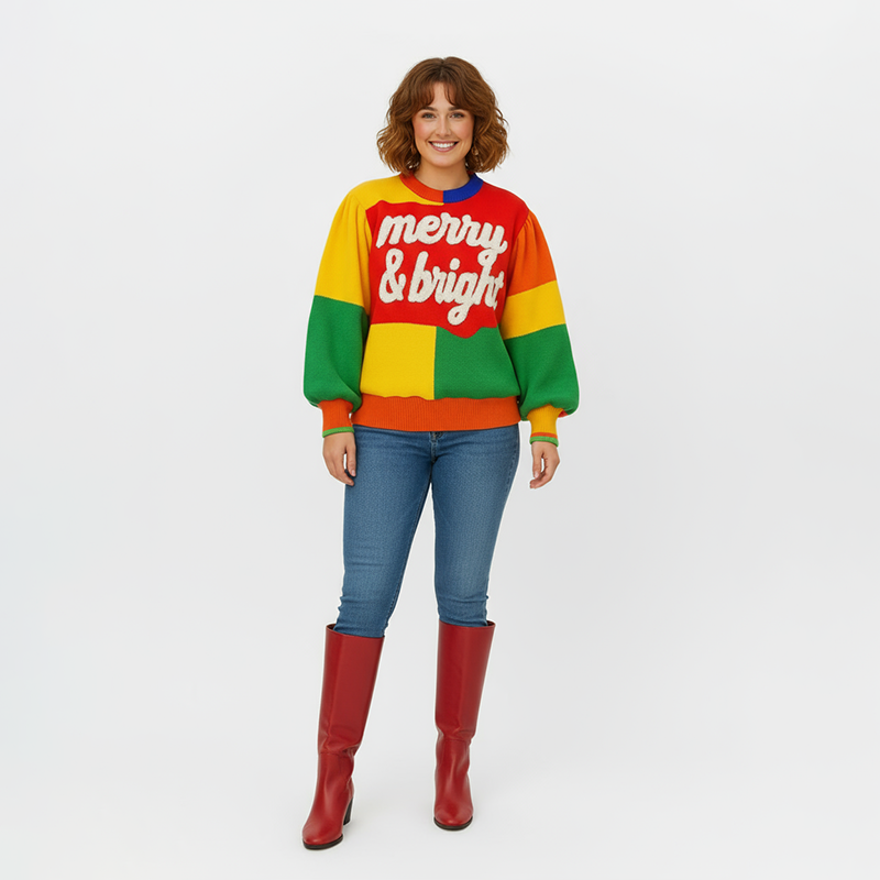 Light up the season with this bold Merry & Bright sweater featuring vibrant color blocking that adds cheer to any holiday outfit.Model is 5'6" and wearing a size Small. Bust: 34", Waist: 26", Hips: 37", Length: 24". You can select your height before purchase for the perfect fit.