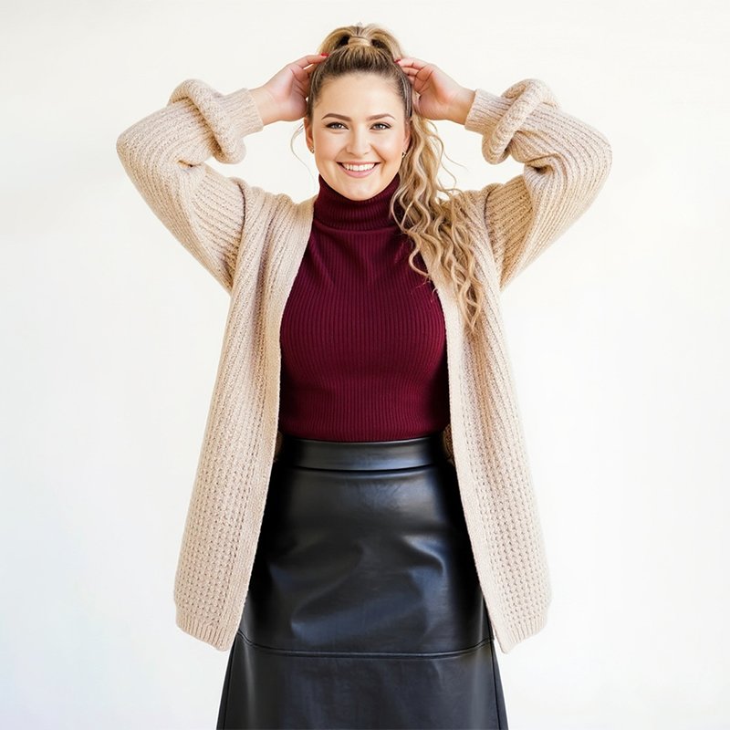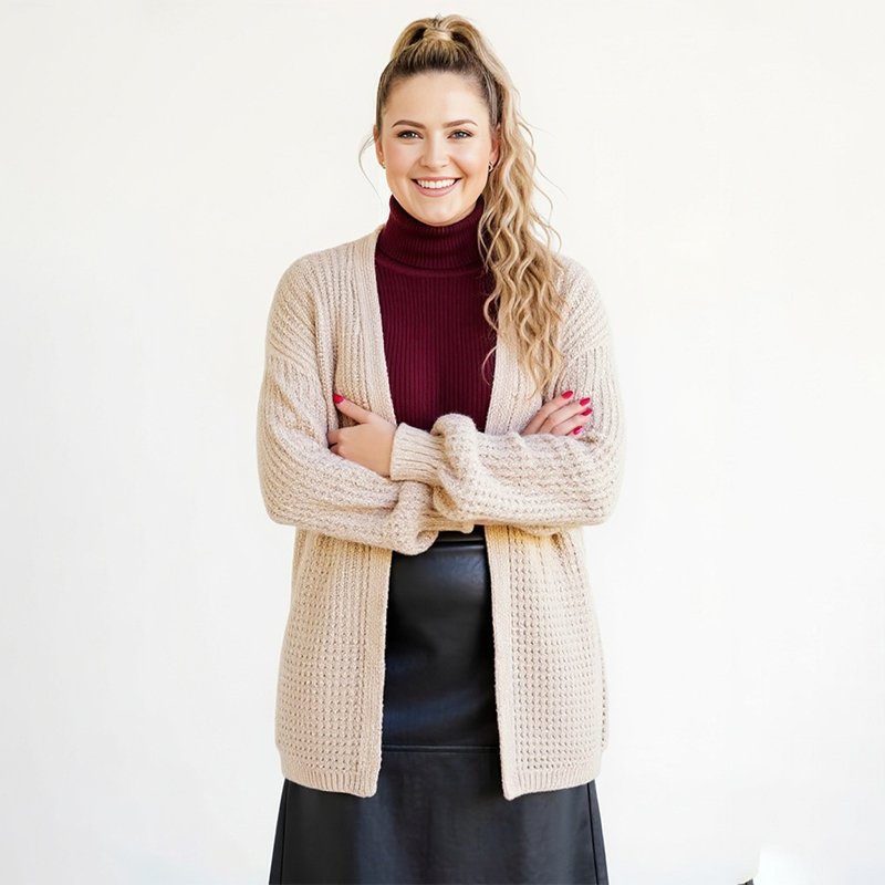 Cozy yet chic, this cream cardigan layers beautifully over a simple top and jeans. Style it with ankle boots, a neutral tote, and gold hoops for an effortless everyday look.