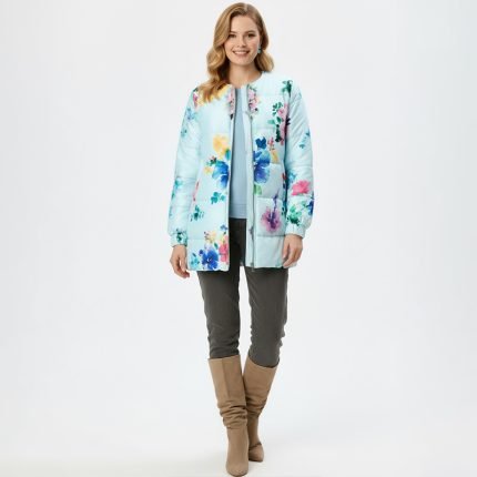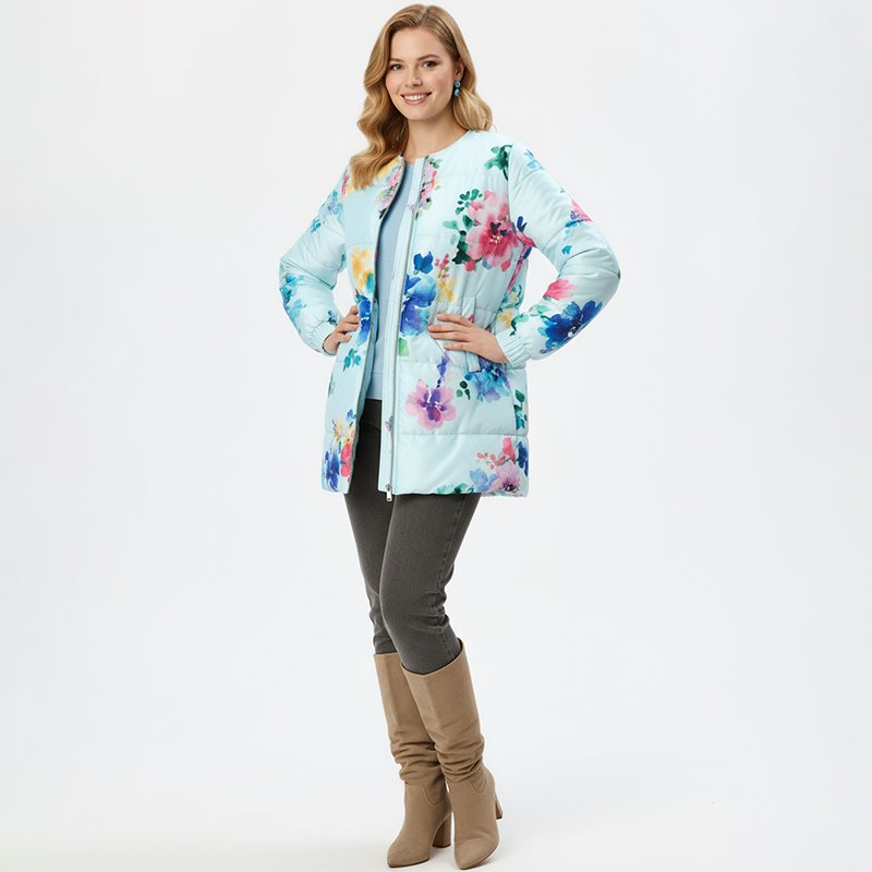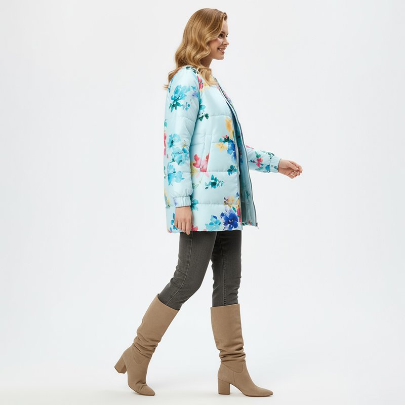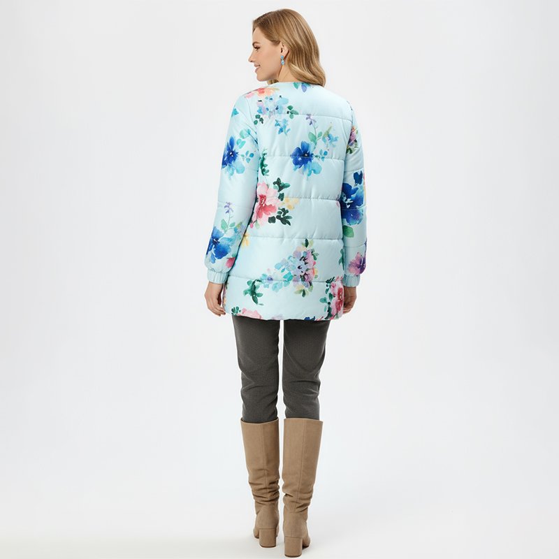 Brighten up chilly days with this denise blue floral puffer jacket, designed to keep you cozy while standing out with its bold multicolor flower prints.