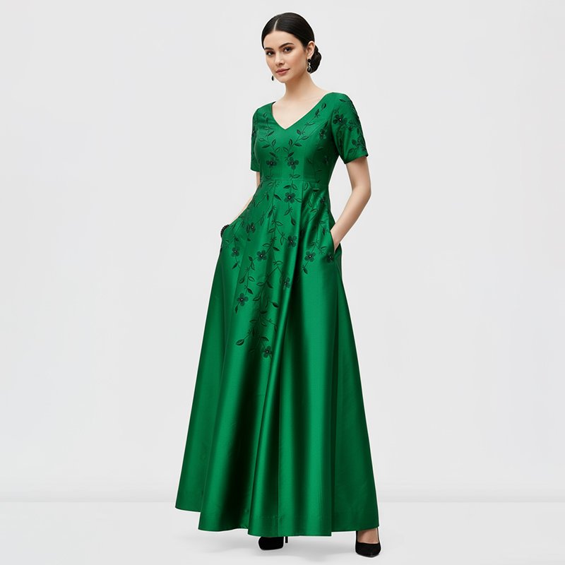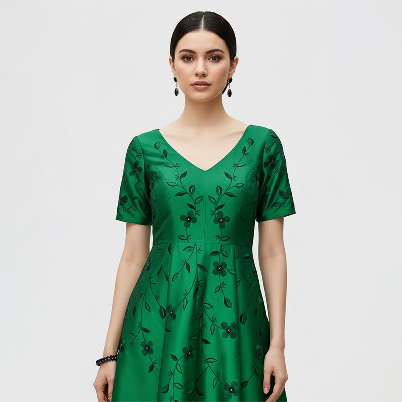 • Elegant green satin fabric with floral embroidery details