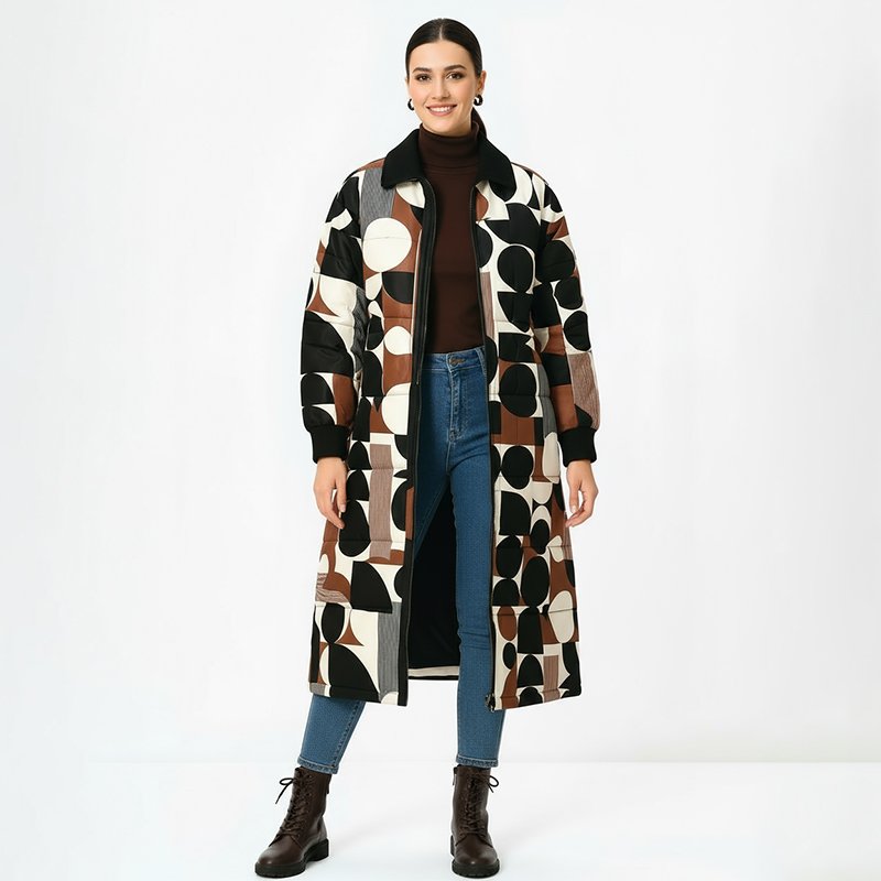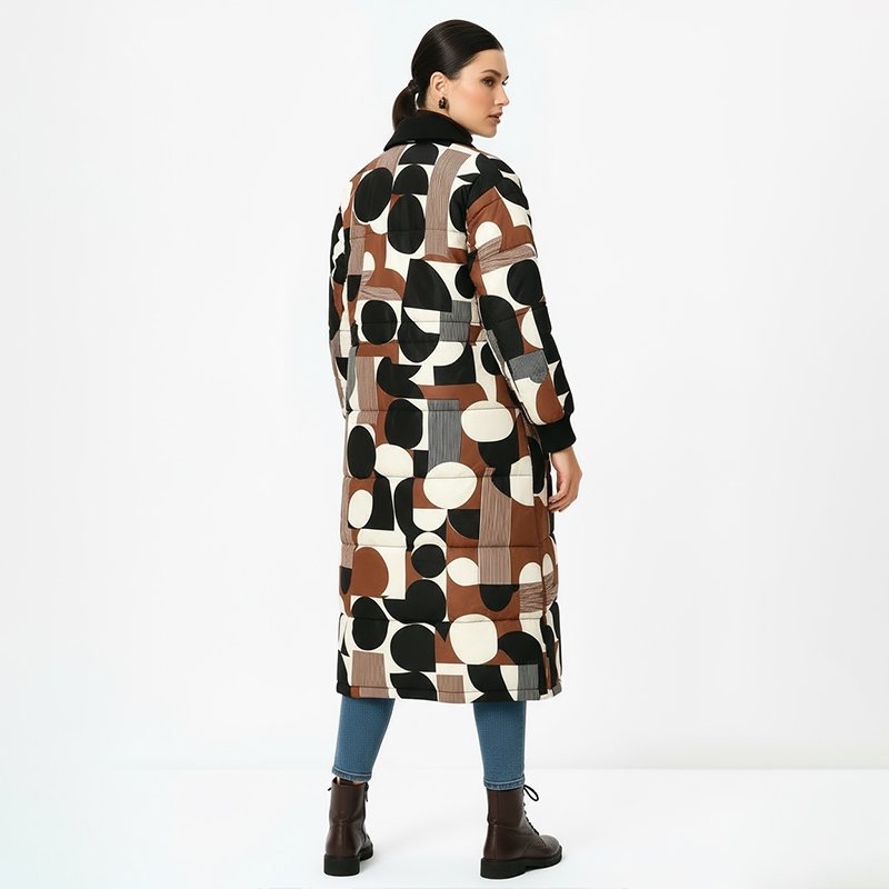 Make a bold statement this winter with a graphic longline puffer coat, blending modern geometric prints with cozy warmth for effortless standout style.