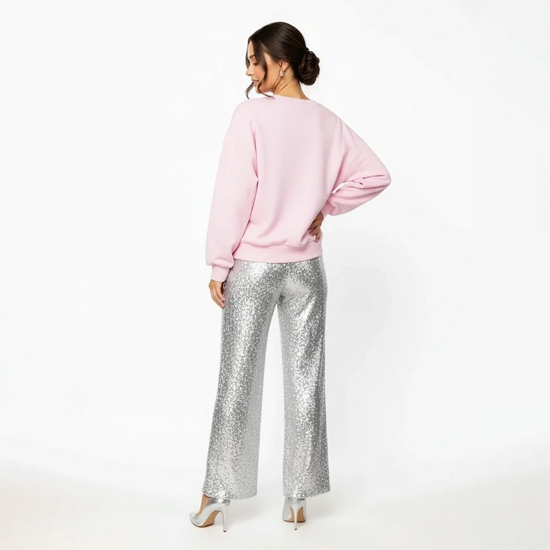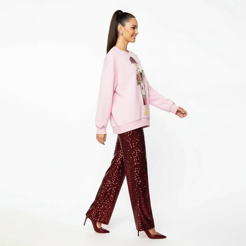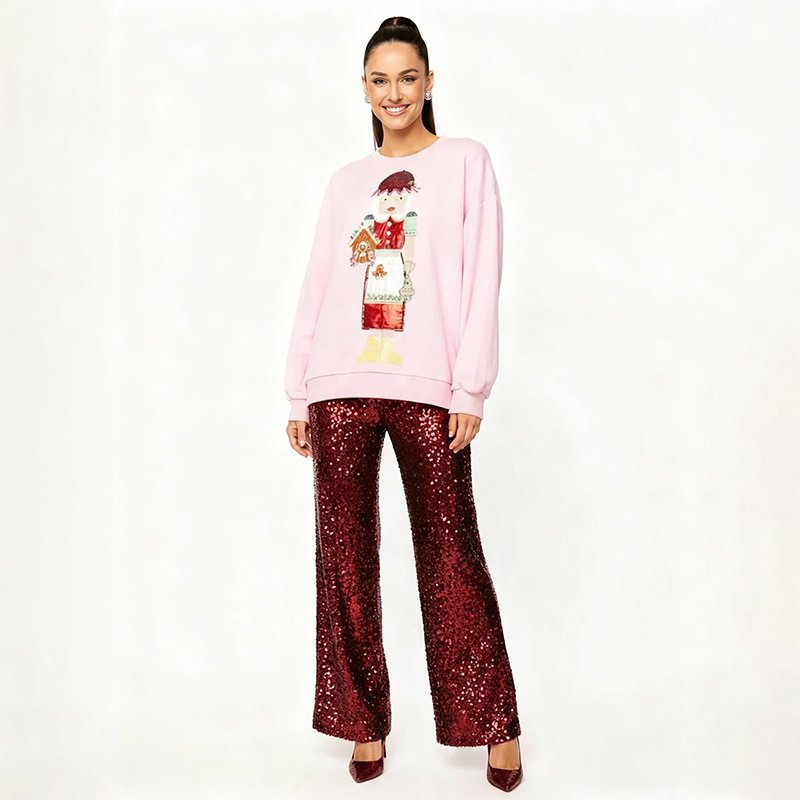 A playful pink Christmas sweater featuring a gingerbread baker holding a holiday house. Pair it with red sequin pants, boots, or pearl hoops for a fun and festive look.