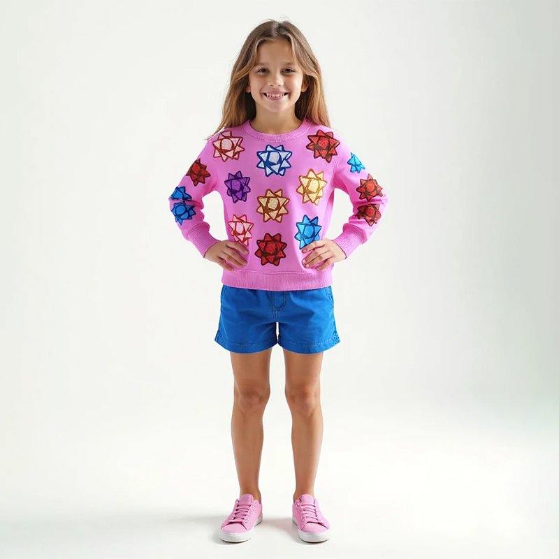 A cheerful holiday sweater featuring colorful gift bows across a soft pink knit. Perfect for school parties, Christmas photos, or cozy winter days with family.