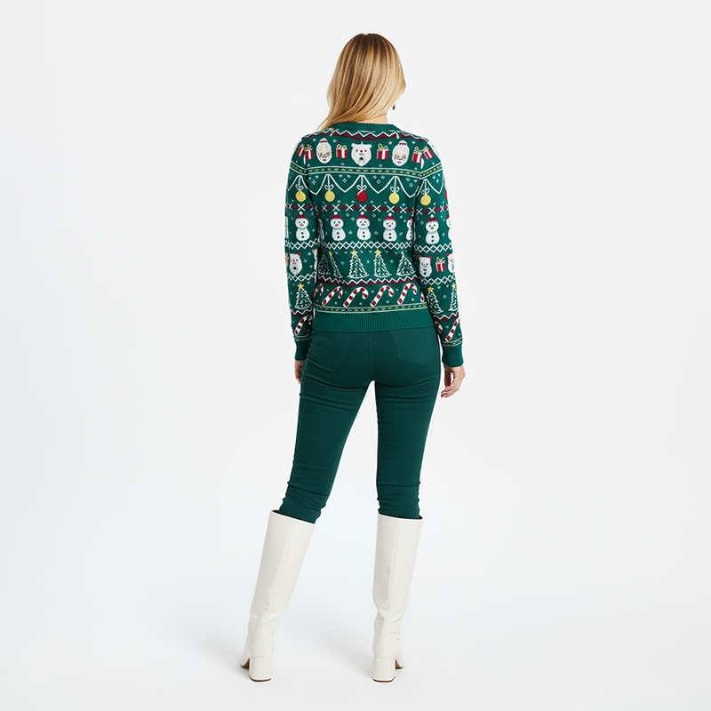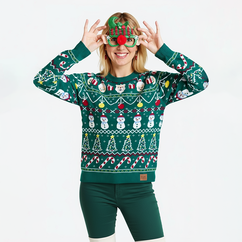 Bring the holiday spirit to life with this Green Candy Cane Snowman Christmas Sweater. A cheerful mix of snowmen, trees, ornaments, and candy canes makes it perfect for parties, family gatherings, or cozy nights by the fire.