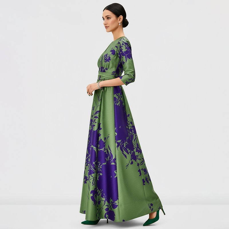 An elegant green maxi dress with bold royal blue floral prints, a belted waist, and a modest keyhole neckline. Perfect for church, weddings, and evening events.