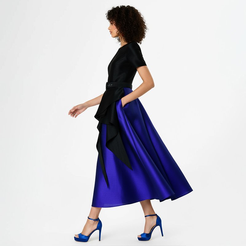 • Striking royal blue A-line skirt with elegant midi length.