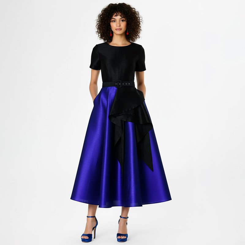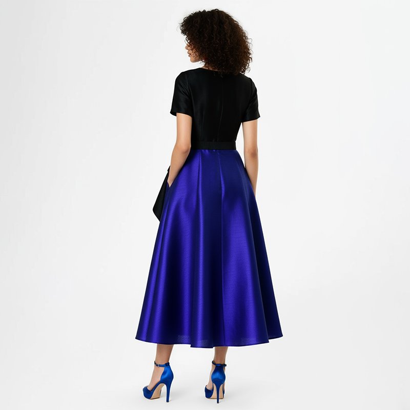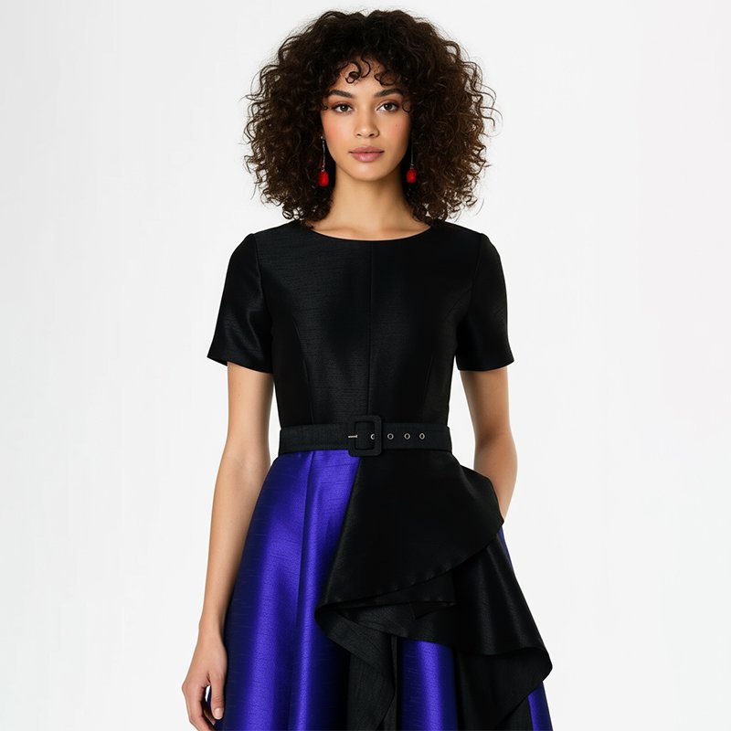 • Black fitted bodice with short sleeves for a structured silhouette.