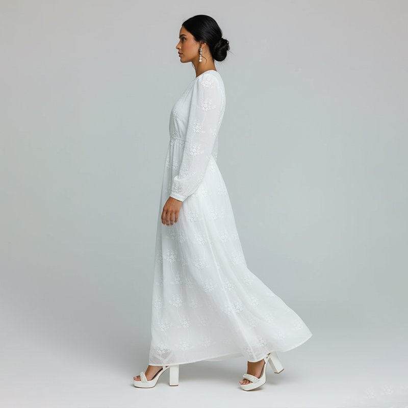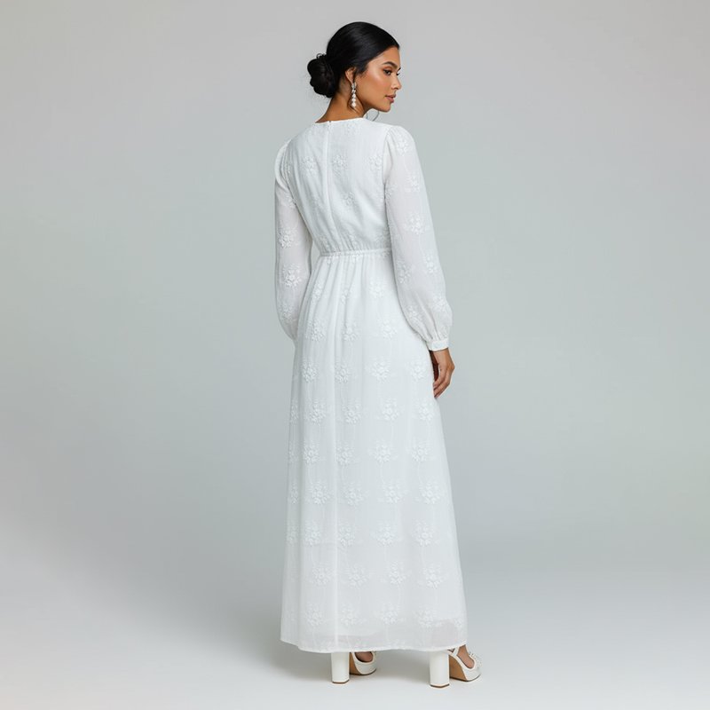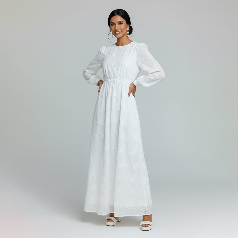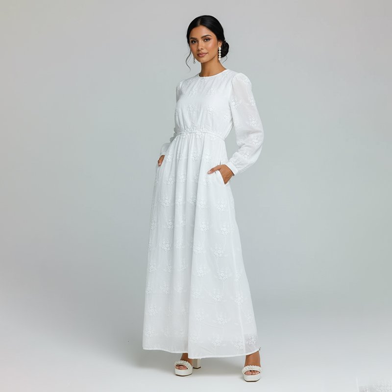 A classic white maxi dress with delicate embroidery, long sleeves, and hidden side pockets. Perfect for church, events, or everyday elegance.