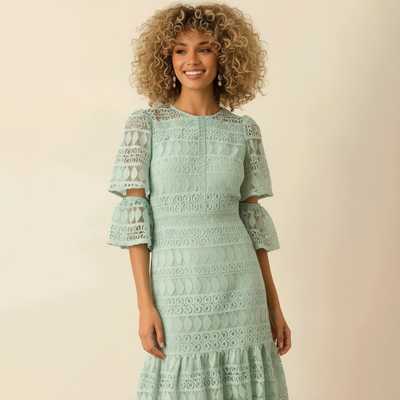You’ll float through weddings and garden parties in airy mint lace that moves beautifully with every step.• Model is 5'9" and wearing a size Small. You can select your height before purchase for the perfect fit.