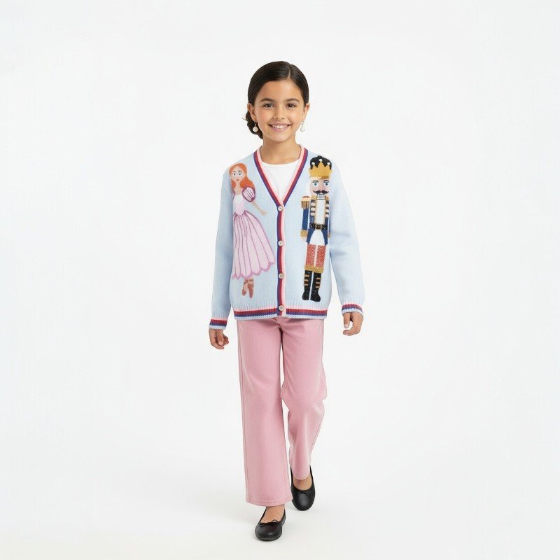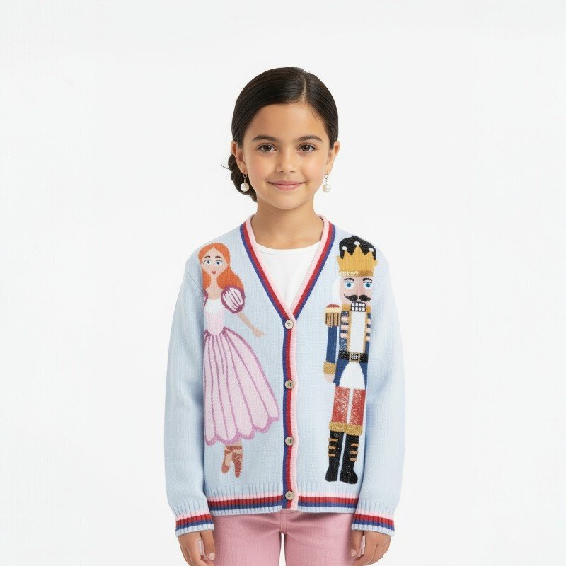 HannahReviewerSuch a charming cardigan! The details on the Nutcracker and ballerina are beautifully made. The ribbed cuffs and hem give a nice, snug fit, so it doesn’t ride up. The cotton fabric feels gentle on her skin — no itchiness at all. Highly recommend for festive occasions!