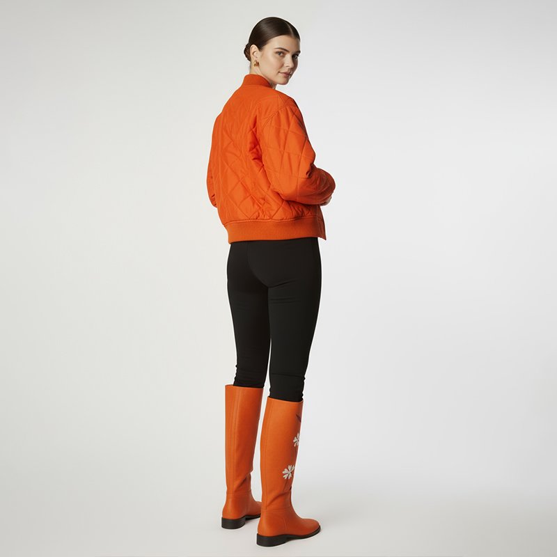 Stand out in bold style with this orange quilted bomber jacket, detailed with delicate floral embroidery. A perfect balance of statement color and feminine charm for everyday wear.
