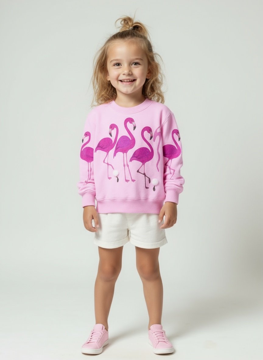 Bring sunshine and smiles into cooler days with this cheerful flamingo sweater. Perfect for Christmas, or family outings — pair it with white shorts, jeans, or a tulle skirt for a bright and playful look.Model is approximately 4'4" and wearing a size Small (6–7).