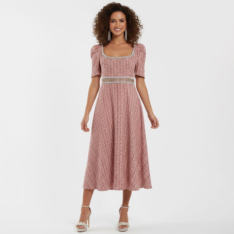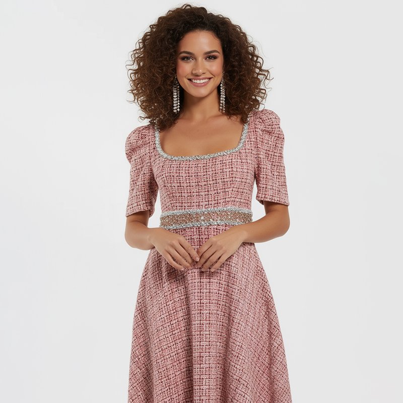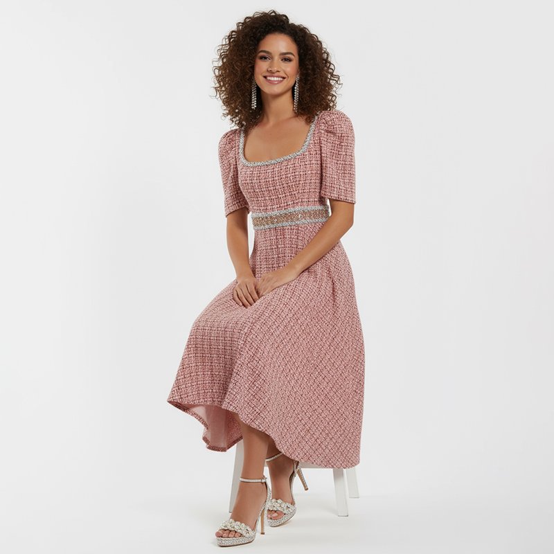A timeless pink midi dress with delicate lace trim, puff sleeves, and a flattering fit. Perfect for Sunday service, special gatherings, or day-to-day elegance.