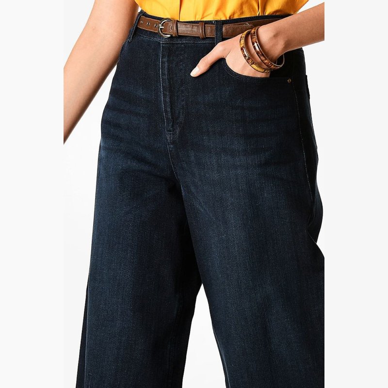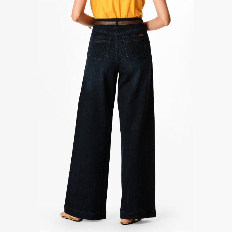 The contrasting top-stitch detailing at the hem enhances the relaxed silhouette of our deep indigo palazzo-style jeans.