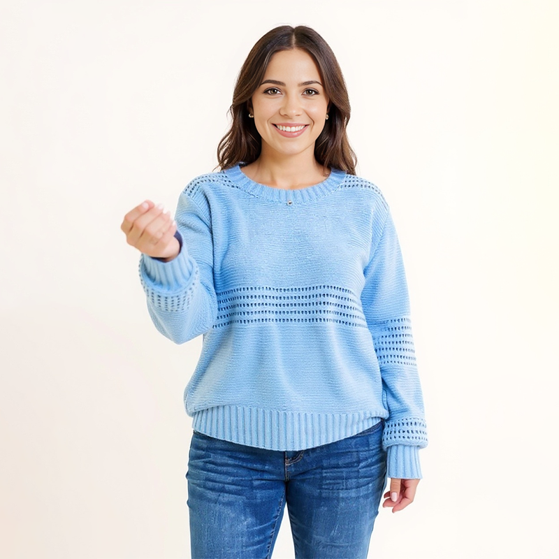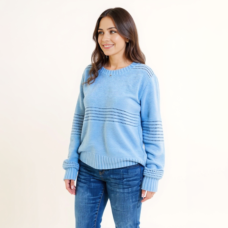 Soft and serene, this light blue pullover is your go-to piece for chilly mornings, office layering, or casual Sundays with family. Its breathable pointelle knit makes it both cozy and lightweight, offering comfort without bulk. Pair it with denim, ankle boots, or a crossbody bag for a look that’s effortlessly pulled together.