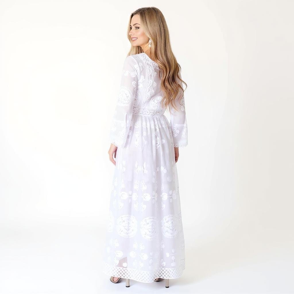 I’m tall—5’10” and ordered a size Large. To my surprise, the length is perfect, even for my height! It’s hard to find maxis that actually work for taller women. The fabric feels amazing and the scalloped sleeves add such a delicate touch.