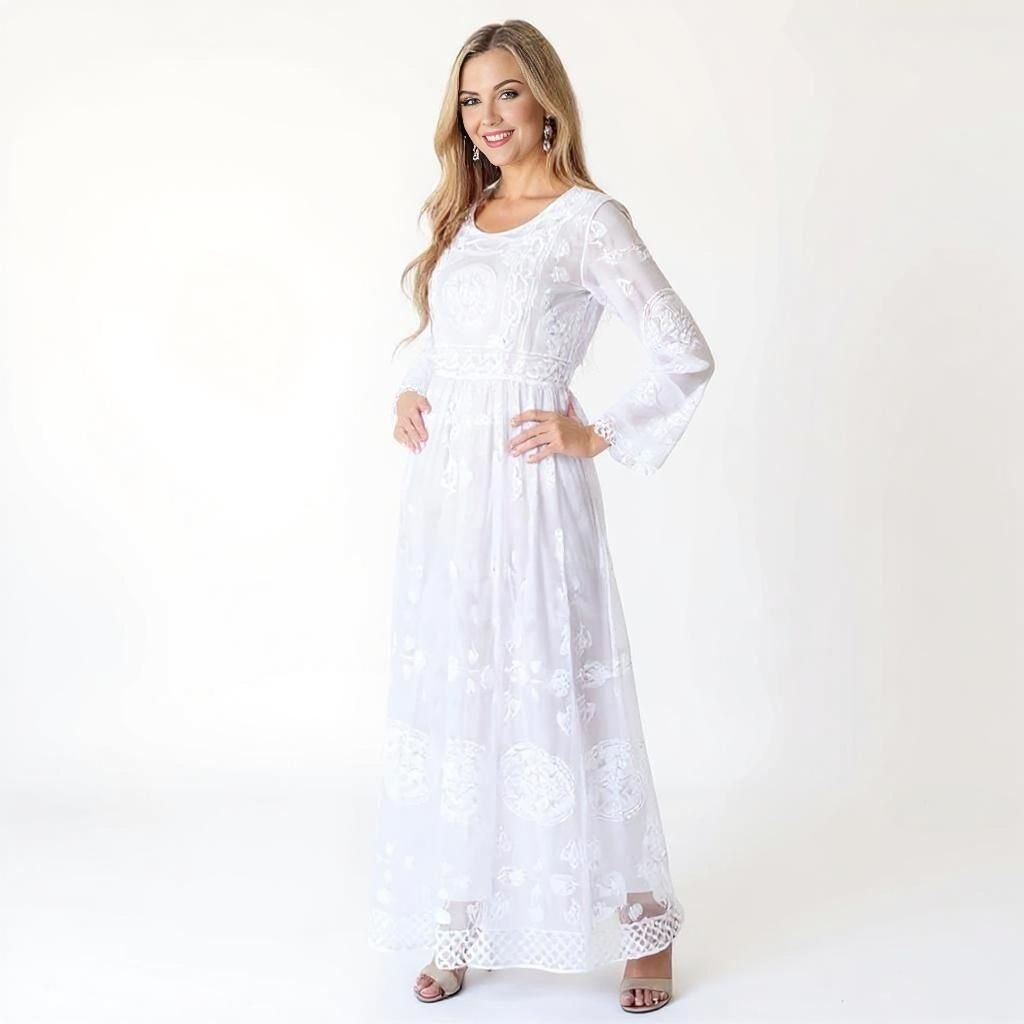 Step into your special moments with elegance and grace in the Romilda Maxi Dress. Its flowing lace and timeless design are ready to accompany you to celebrations, worship services, or cherished gatherings, letting you shine with beauty and modesty.