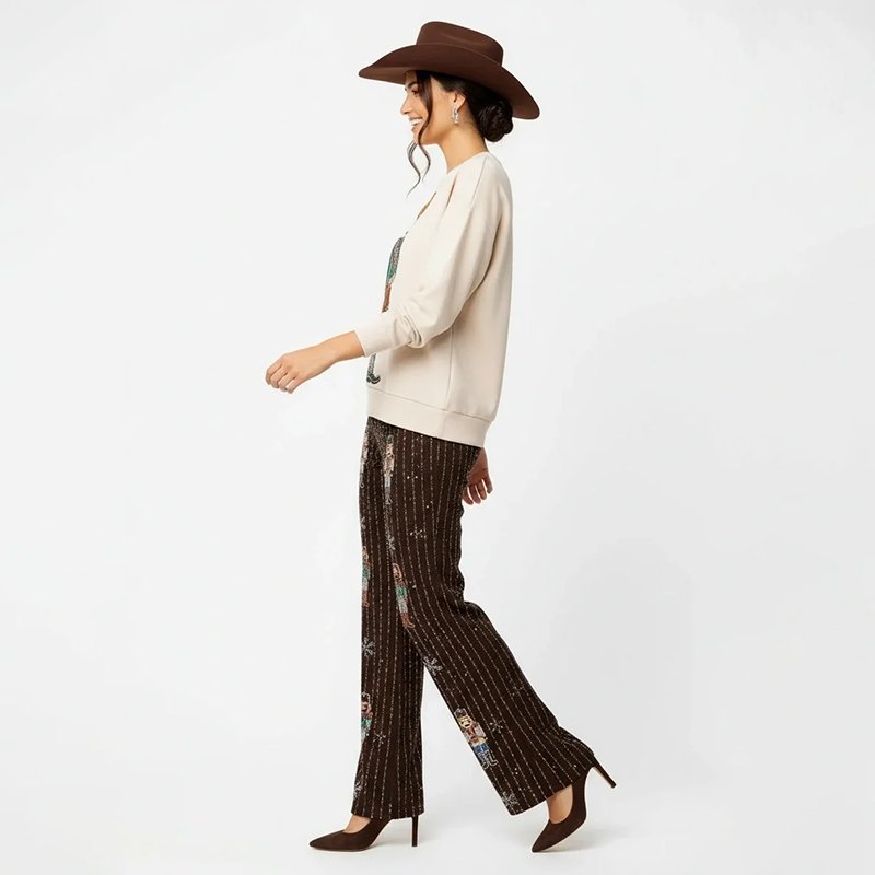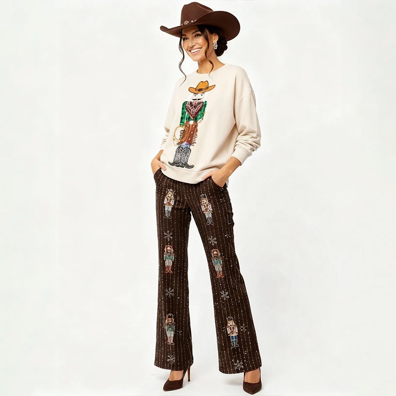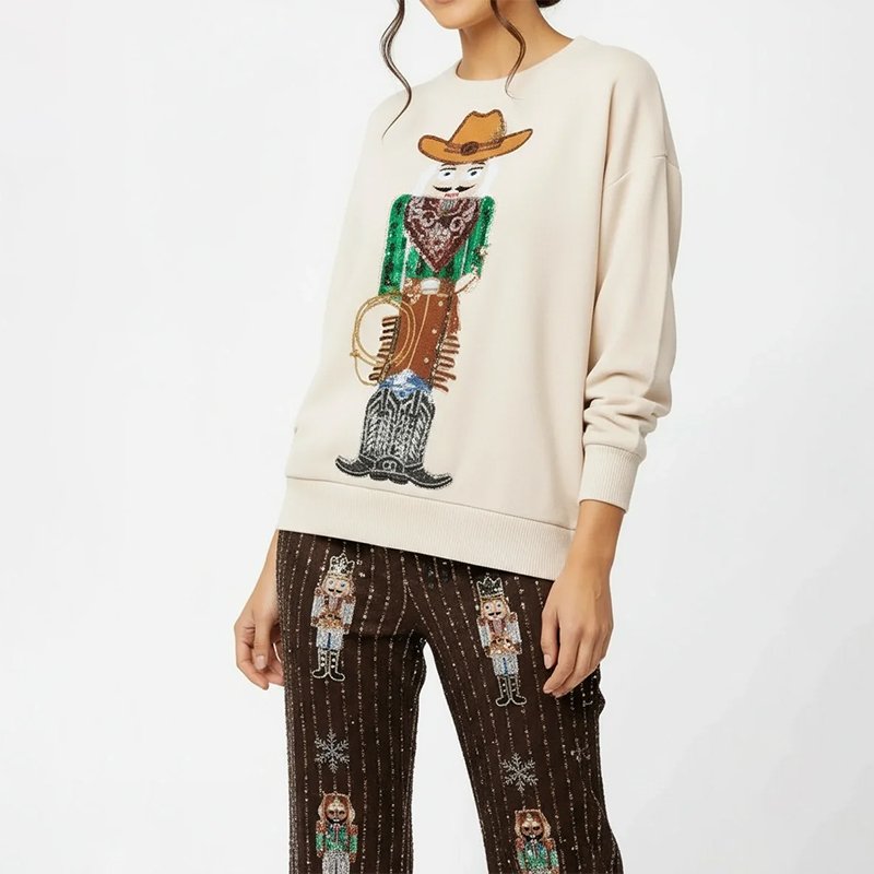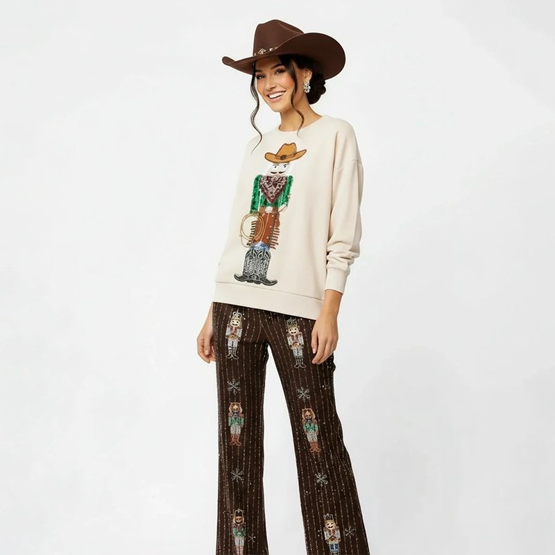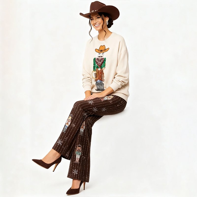 A cozy cream Christmas sweater featuring a festive Western cowboy print. Pair it with dark denim, brown boots, or a felt hat for a fun and stylish holiday look.