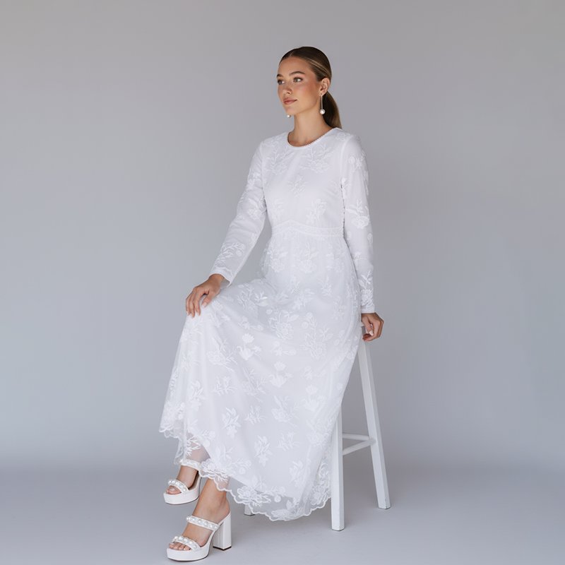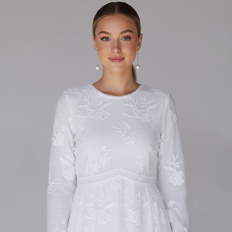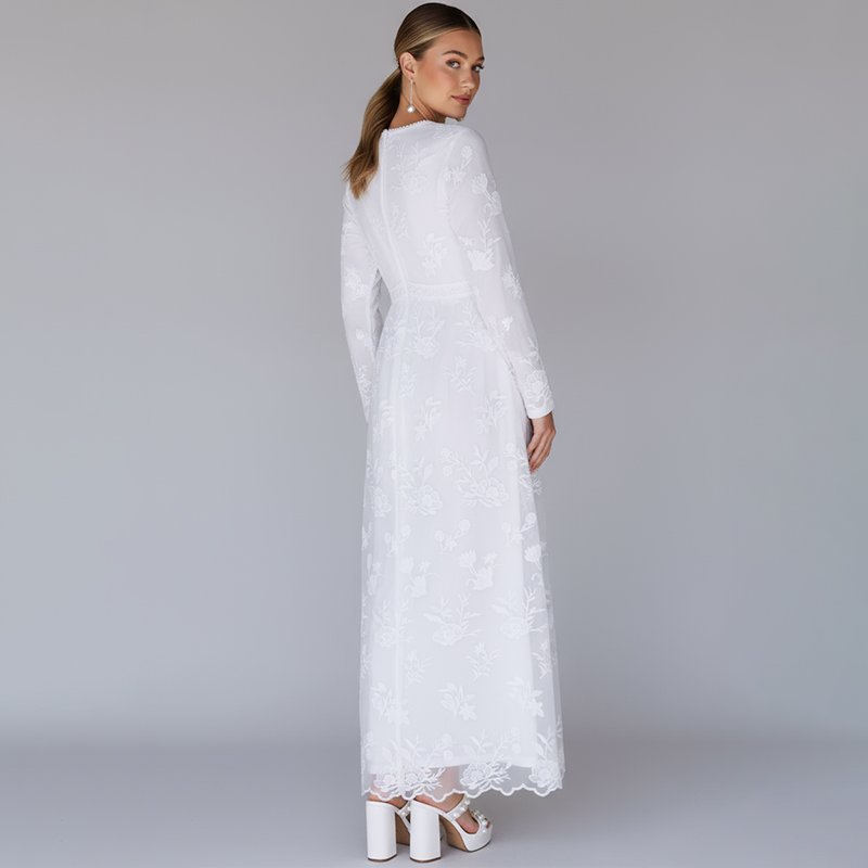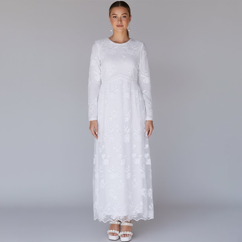 A graceful white maxi dress with delicate floral embroidery and modest long sleeves. Perfect for church, weddings, or formal occasions.
