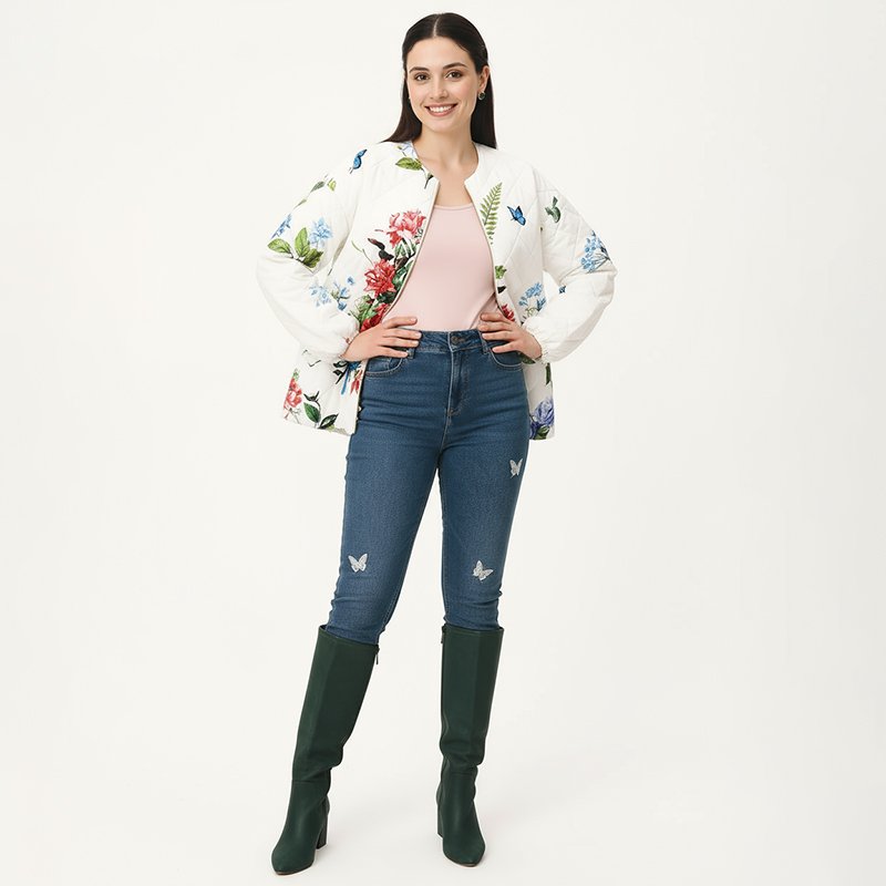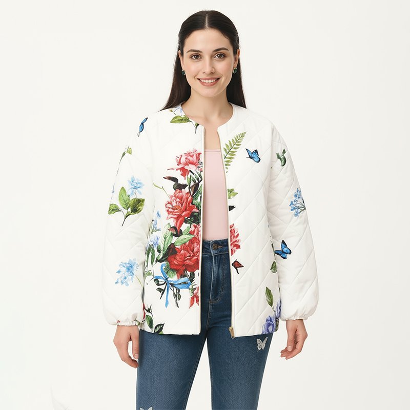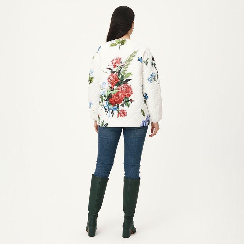Bring elegance to your everyday wardrobe with this quilted jacket featuring vibrant floral prints and delicate butterflies. A statement layering piece that’s both lightweight and eye-catching.Model is 5'6" and wearing a size Medium. Bust: 35", Waist: 27", Hips: 38", Length: 27". You can select your height before purchase for the perfect fit.