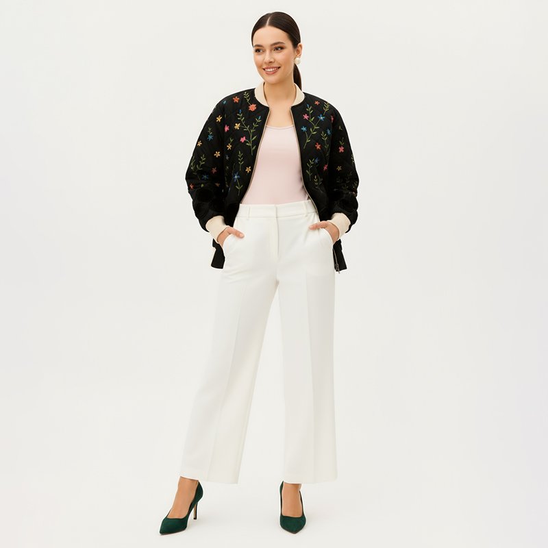 Add a touch of elegance to your outerwear with this floral embroidered bomber jacket. The playful stitched blooms and modern bomber fit make it perfect for layering from day to night.