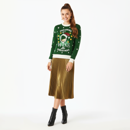 Raise a glass to the holidays in this playful green sweater, designed for wine lovers who want to celebrate in cozy, sparkling style. Perfect for parties, family gatherings, or a fun girls’ night in.