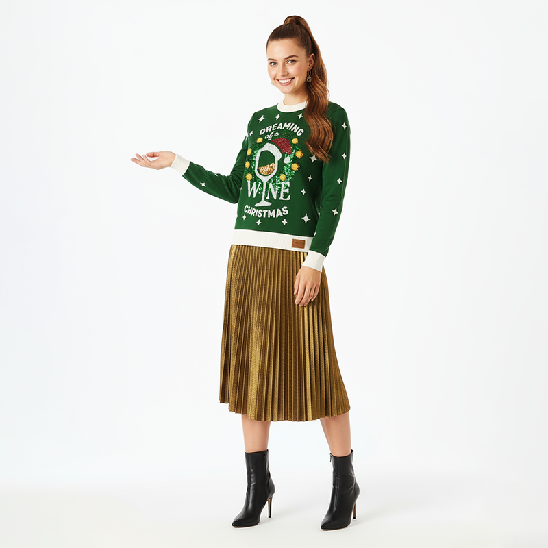 Raise a glass to the holidays in this playful green sweater, designed for wine lovers who want to celebrate in cozy, sparkling style. Perfect for parties, family gatherings, or a fun girls’ night in.