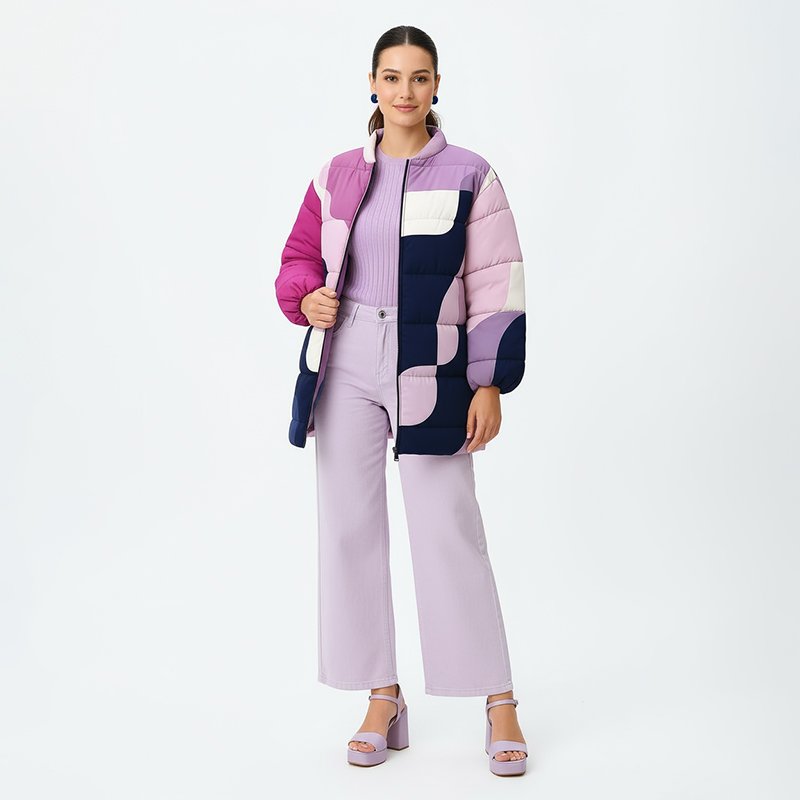 Turn heads in this bold lilac colorblock puffer jacket. With its modern patchwork design and cozy quilted warmth, it’s the ultimate statement piece for chilly days.Model is 5'6" and wearing a size Medium. Bust: 35", Waist: 27", Hips: 38", Length: 29". You can select your height before purchase for the perfect fit.